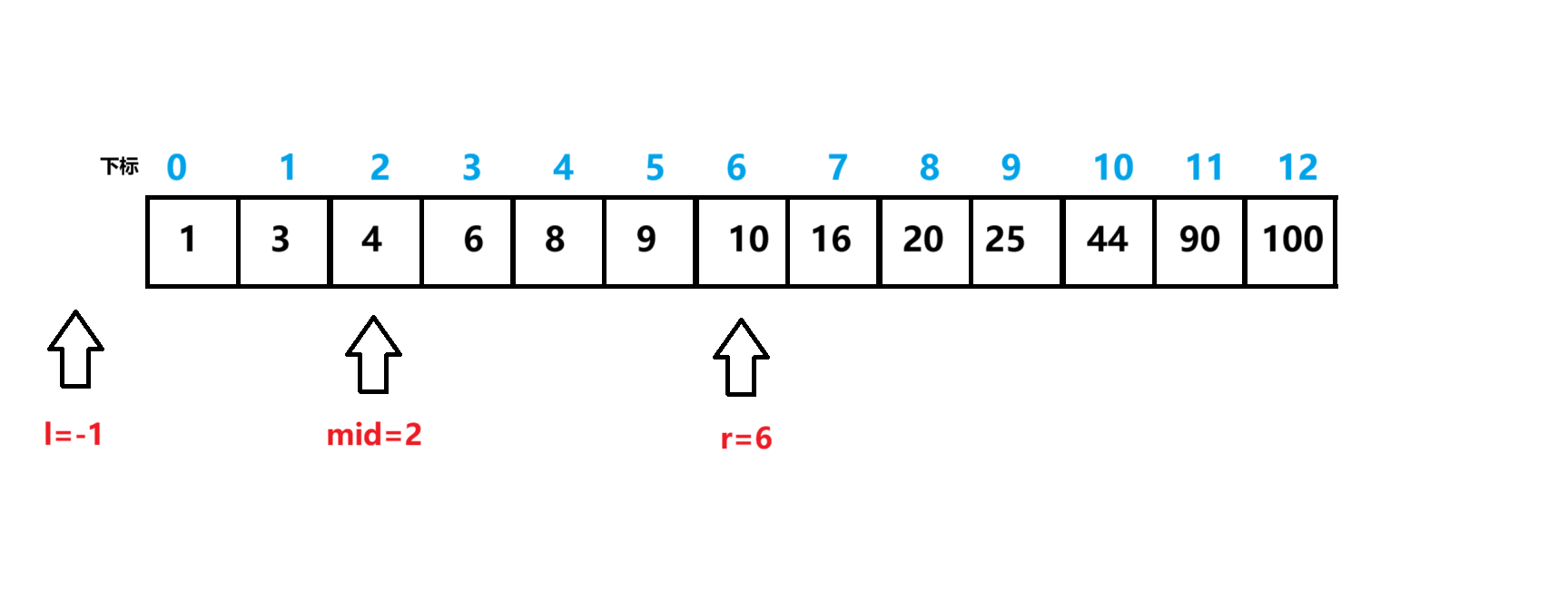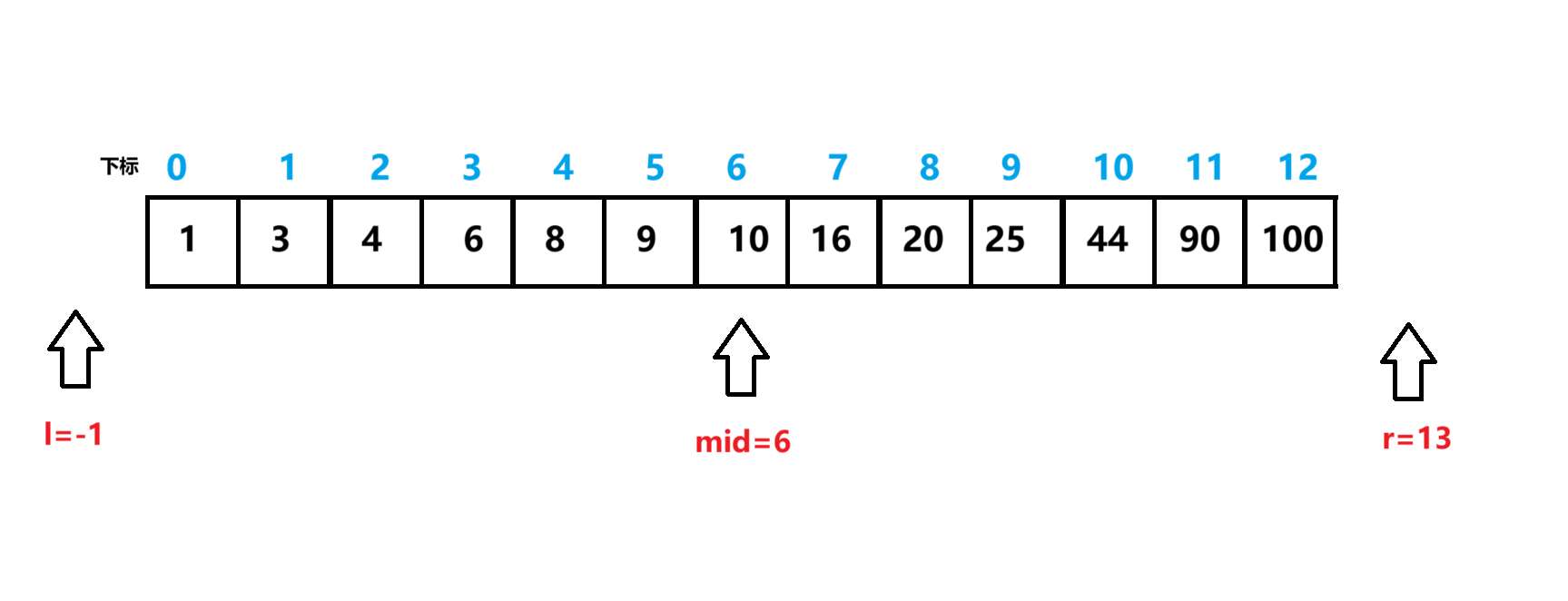 第一次进入while(l+1<r),第一次执行 int mid = l + r >> 1 ,此时mid = -1+ 13 >> 1 = 6