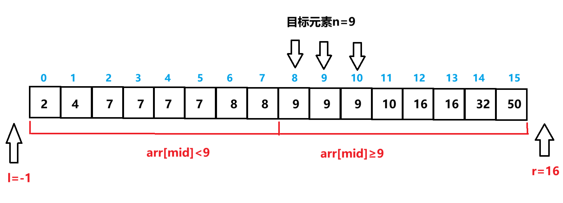 答案都在左边界上了,那么左边界在更新的时候,就要考虑答案是否在左边界上了。所以给l赋值的时候,范围要包含目标元素。