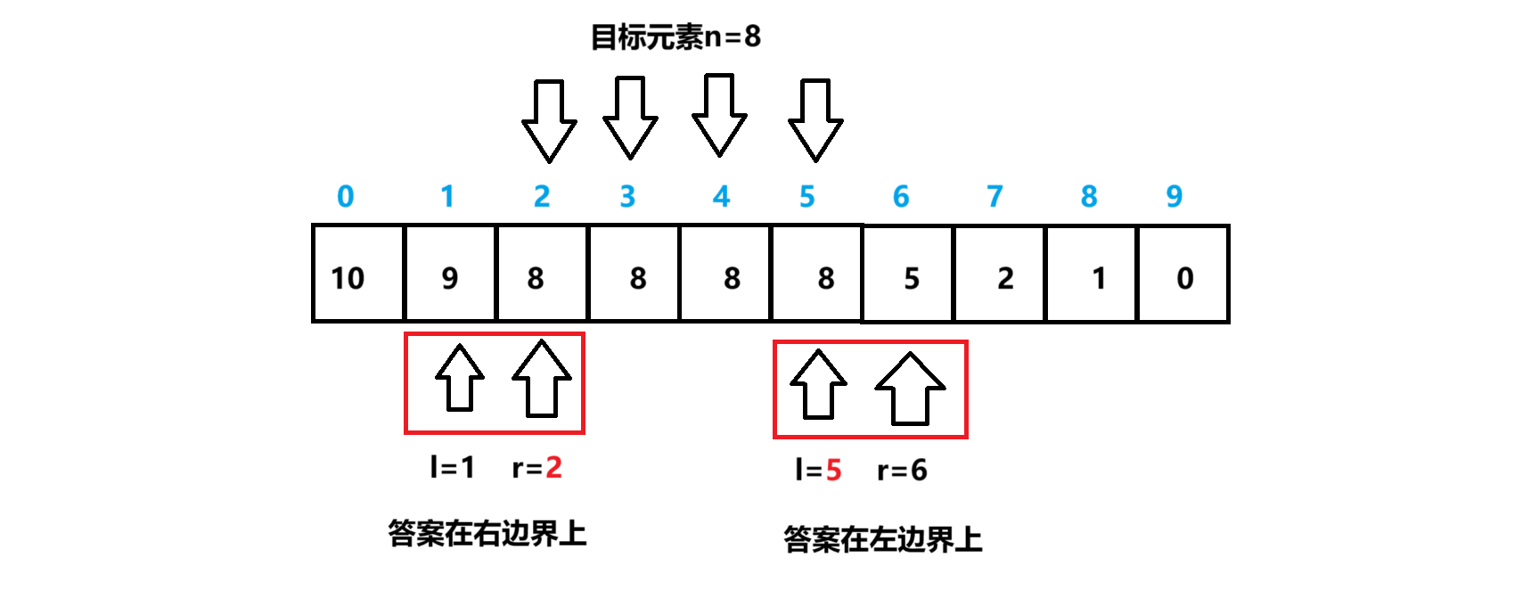 - 如果更新右边界,使目标元素最终在右边界上,我们称为“答案在右边界上” 。